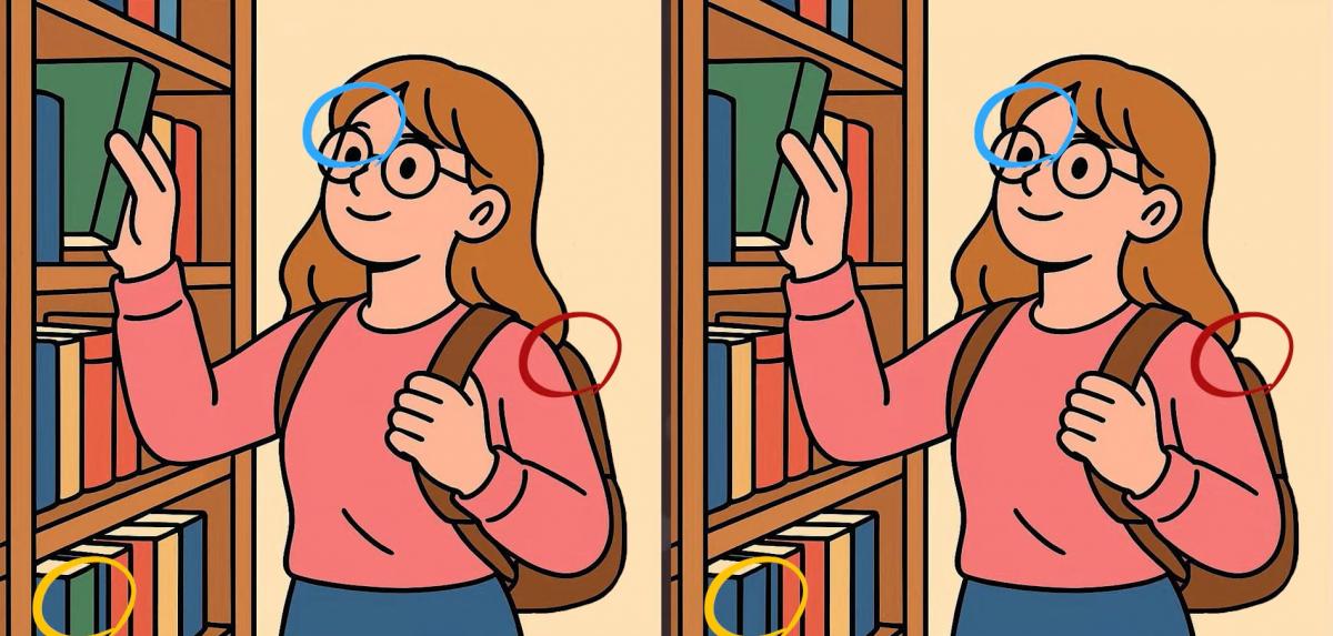 Så er du klar til den næste udfordring? Se nærmere på to billeder af en pige, der vælger bøger på et bibliotek. De ser måske ens ud ved første øjekast, men der er 3 små forskelle. Tror du, at du kan finde dem alle på 19 sekunder? Prøv det, og test din synsstyrke!