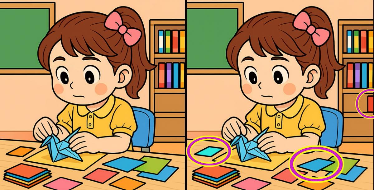 Så er du klar til den næste udfordring? Se nærmere på to billeder af en pige, der laver papirfugle. De ser måske ens ud ved første øjekast, men der er 3 små forskelle. Tror du, at du kan finde dem alle på 19 sekunder? Prøv det, og test din synsstyrke!