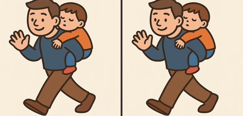 Så er du klar til den næste udfordring? Se nøje på de to billeder af en mand, der bærer en baby på ryggen. De ser måske identiske ud ved første øjekast, men der er 3 små forskelle. Tror du, at du kan finde dem alle på 19 sekunder? Prøv det, og test din synsstyrke!