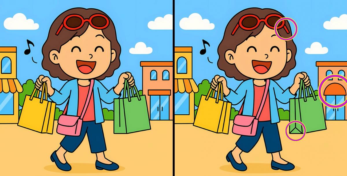 Så er du klar til den næste udfordring? Se nøje på de to billeder af pigen med indkøbsposerne. De ser måske identiske ud ved første øjekast, men der er 3 små forskelle. Tror du, at du kan finde dem alle på 71 sekunder? Prøv det, og test din synsstyrke!