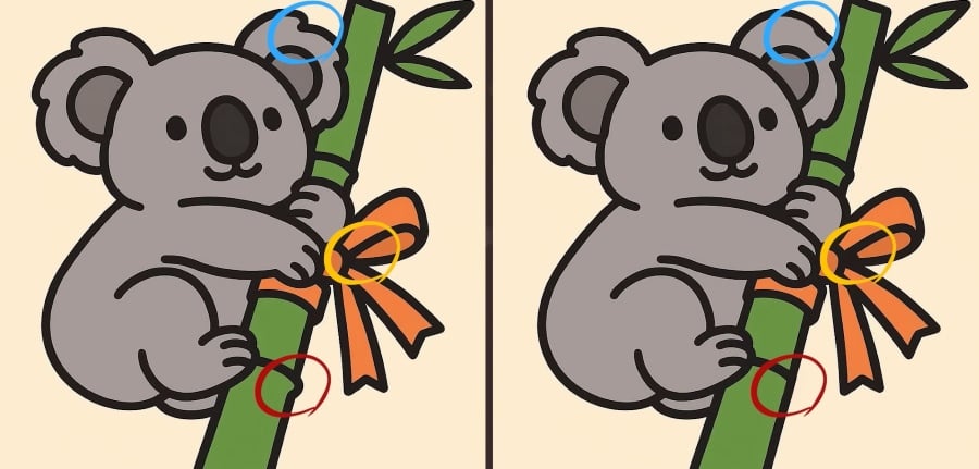 Så er du klar til den næste udfordring? Se nøje på de to billeder af en koala, der krammer bambus. De ser måske ens ud ved første øjekast, men der er 3 små forskelle. Tror du, at du kan finde dem alle på 33 sekunder? Prøv det, og test din synsstyrke!