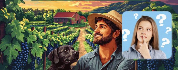 Nedenfor ser du et billede af en vingård, hvor en mand er i gang med at plukke druer. I nærheden står hans trofaste hund, som aldrig lader sin ejer være alene. Det ser ud til, at hvad kunne være usædvanligt her?
