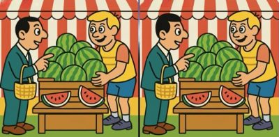 Så er du klar til udfordringen? Se nærmere på de to billeder af en mand, der køber en vandmelon. I første omgang ser billederne måske ens ud, men der er 3 små forskelle. Tror du, at du kan finde dem alle på 27 sekunder? Prøv det, og test din synsstyrke!