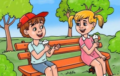 På billedet ser vi en dreng og en pige, der sidder på en parkbænk og spiser is. I baggrunden kan vi se træer med store grønne kroner. Vejrforholdene på billedet tyder på, at handlingen finder sted om sommeren.